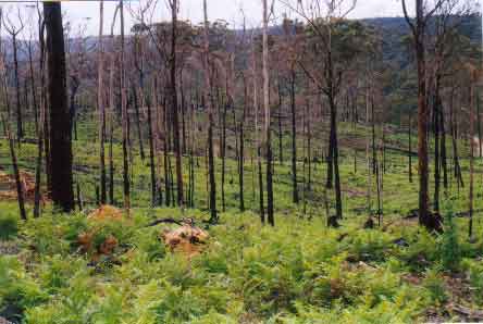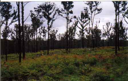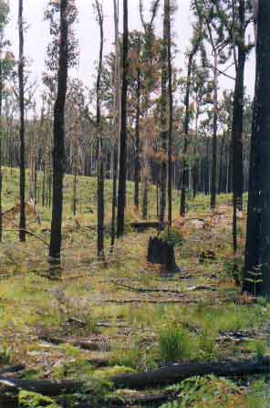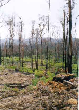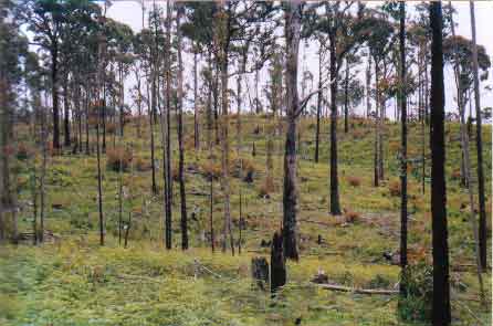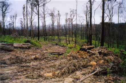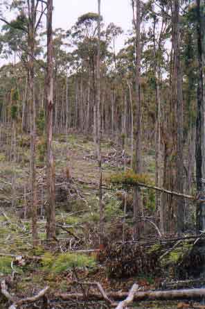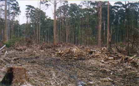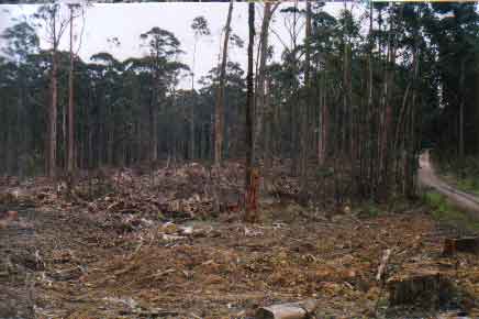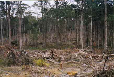 This logging coup is right in the middle of an ephemeral (seasonal) watercourse. The above photos illustrate in general the extent to which the Wombat Forest has been exploited for timber over the last 150 years. There is a distinct lack of older trees which is of concern as these "senescent" or "over-mature" trees are the ones that provide habitat for the species that make up the biodiversity of a forest. In addition, the failure to protect riparian (streamside) vegetation will result in poor water quality throughout the entire river system downstream from where it feeds into. Unfortunately our forest managers believe that forests are only there to provide timber for sale and that to sell timber we must remain "competitive in a global market". This economic pressure leads to clearfelling being used as a logging and forest management system which, in turn, results in a degradation of the intrinsic natural values of forest. |
