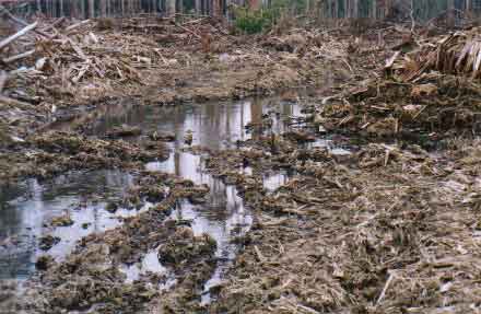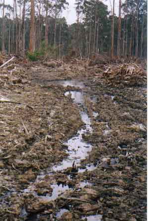 This series of photos illustrates how clearfelling can severely impact on water quality. Depressions left by logging machinery fill with water that becomes stagnant and hosts dangerous pathogens. After rain the polluted water is flushed into waterways that often provide drinking water for rural communities and habitat for numerous freshwater species. The sediments in the water also choke these species just as we humans would suffer in a extended dust storm. This area is in the headwater catchments of the Murray river. It is eay to see how these destructive management practices can impact upon all the natural systems and organisms between the headwaters and the Great Southern Ocean.