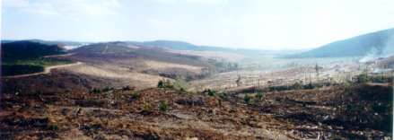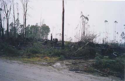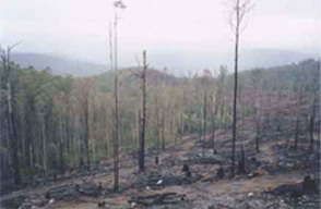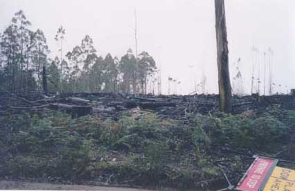 The Department of Sustainability and Environment (DSE) forestry experts prefer this method of logging because it is cost effective i.e. the most amount of timber for the least amount of effort and because it supposedly "mimics nature". Despite constant criticism and evidence to the contrary from public and scientists alike, they still claim that this clearing and burning "mimics" natural processes! Any similarity between bushfire and clearfelling is purely superficial. There is no natural process that leaves results like those of logtrucks, bulldozers, logloaders or any similar twenty tonne piece of logging machinery. These machines either compact soils or grind and churn through the soil bringing acid sulphate subsoils to the surface. This results in complex chemical reactions which can in turn cause problems for soil micro flora and fauna.