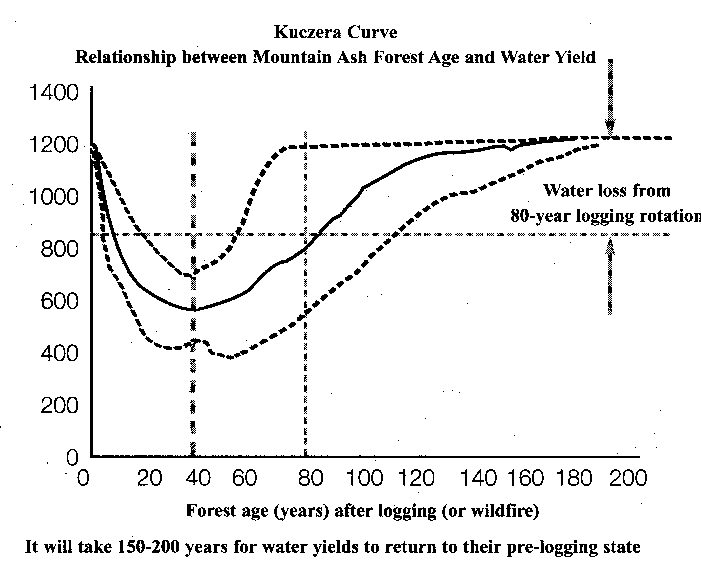 In 1998, the Cooperative Research Centre for Catchment Hydrology reported that run-off from a clear-felled coupe in a mountain ash forest halves over the first 40 years and does not recover until the regrowth is more than 150 years old. This means an extra 17,000 megalitres of water a year would flow into Melbourne's Thomson Dam if the forest was left to grow old, according to a government-appointed committee discussion paper on meeting future water needs. The $147 million value of the extra water compares with the $1.43 million a year the government earns from the logging.