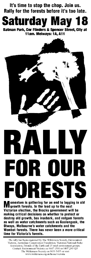 RALLY FOR OUR FORESTS Saturday May 18 Batman Park, Cnr Flinders & Spencer Street, Melbourne City 11am, Melways: 1A, A11 (opposite the State ALP conference - Melbourne Convention Centre) Momentum is gathering for an end to logging in old growth forests. In the lead up to the next Victoria Election, the Bracks government will be making critical decisions on whether to protect or destroy old growth forests and water catchments such as Goolengook the Otways, Melbourne's water catchments and the Wombat forests. There has never been a more critical time for Victoria"s forest. Be seen, be heard, voice your dissent, and let everyone know that votes will be NOT go the ALP on their current disastrous policies. Rally has been organised by TWS, ACF, VNPA, FOE and 15 rural groups. 20-4-02