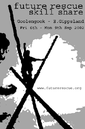 details A "skillshare" is being held at Gook from Sep. 6th - 9th. Take advantage of this opportunity to become oriented and familiar with the terrain, roads, tracks and tactics before the shyte goes down. Workshops will be conducted on ecology, climbing, orienteering/maps, GPS, rope skills, blockade etiquette, survival,hair tubing, other statewide forest campaigns, legalities and threats to civil liberties and much much more !!! Jam sessions & storytelling @ nite. BYO food for communal cooking space ; some (vegan) catering will also be provided by GECO kitchen. Please leave dogs @ home ! BYO camping and wet weather gear. Directions : >From Melb, head along Princes Hwy to Orbost. Continue past Cabbage Tree, and Bellbird Pub. Turn LEFT @ Bemm River bridge. Follow this rd (Club Terrace Loop Rd) till ya reach white farmhouse on Left. Veer LEFT onto Goolengook Rd. Follow forever till ya reach 'Bee Tree Track'. We will be @ this junction. Troubleshooting, call GECO 03 51540156