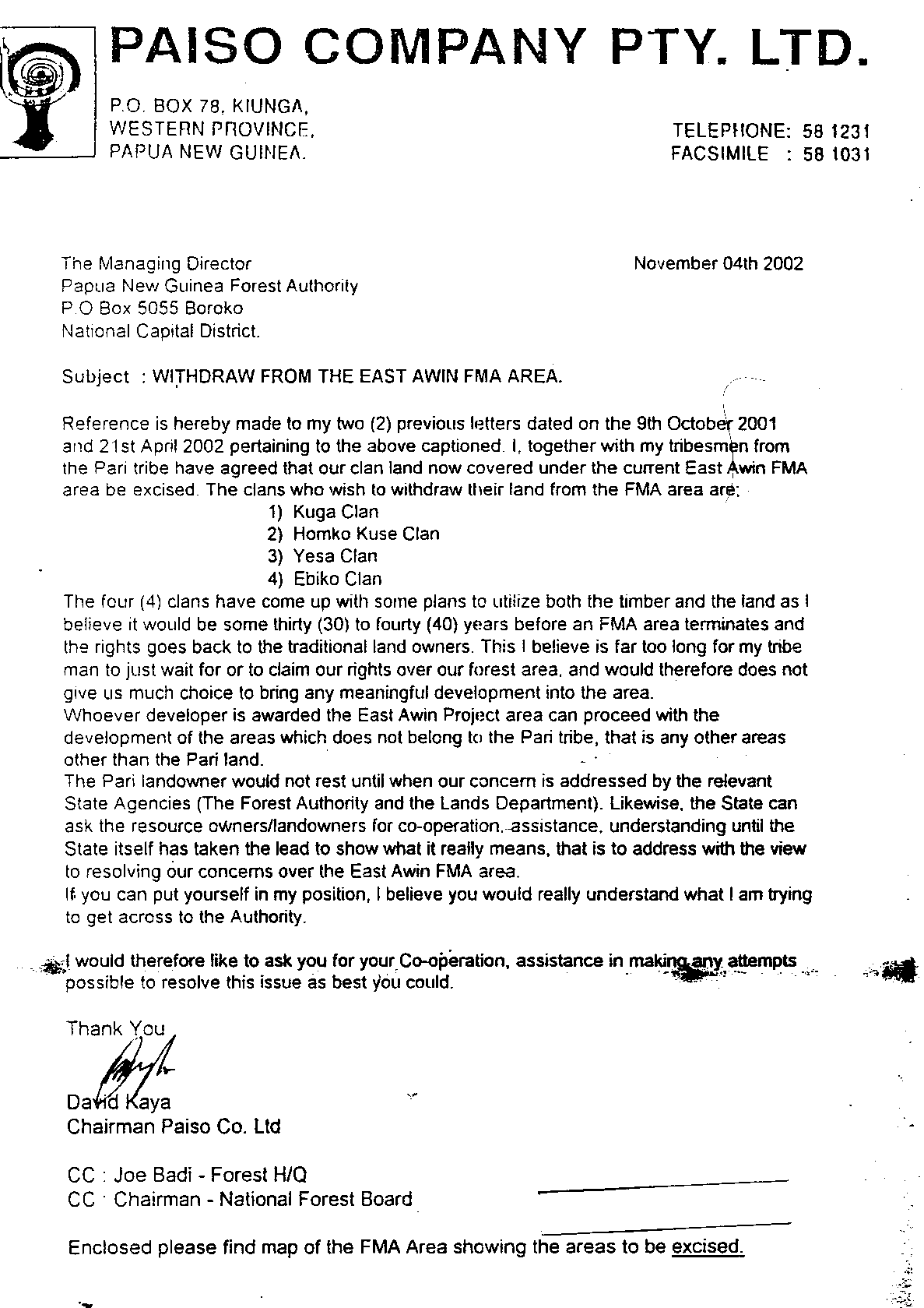 The landowners of the Pari Tribe in the remote northern region of Western province have written to the Forest Authority requesting that the land belong to their four clans be removed from the controversial East Awin FMA (see below).