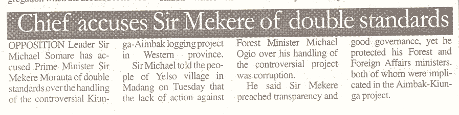 At the same time, our current Prime Minister, Sir Michael Somare was accusing Morauta of double standards and he labelled as ‘corruption’ Morauta’s failure to take action against two of his Ministers for their involvement in the Kiunga Aiambak affair.