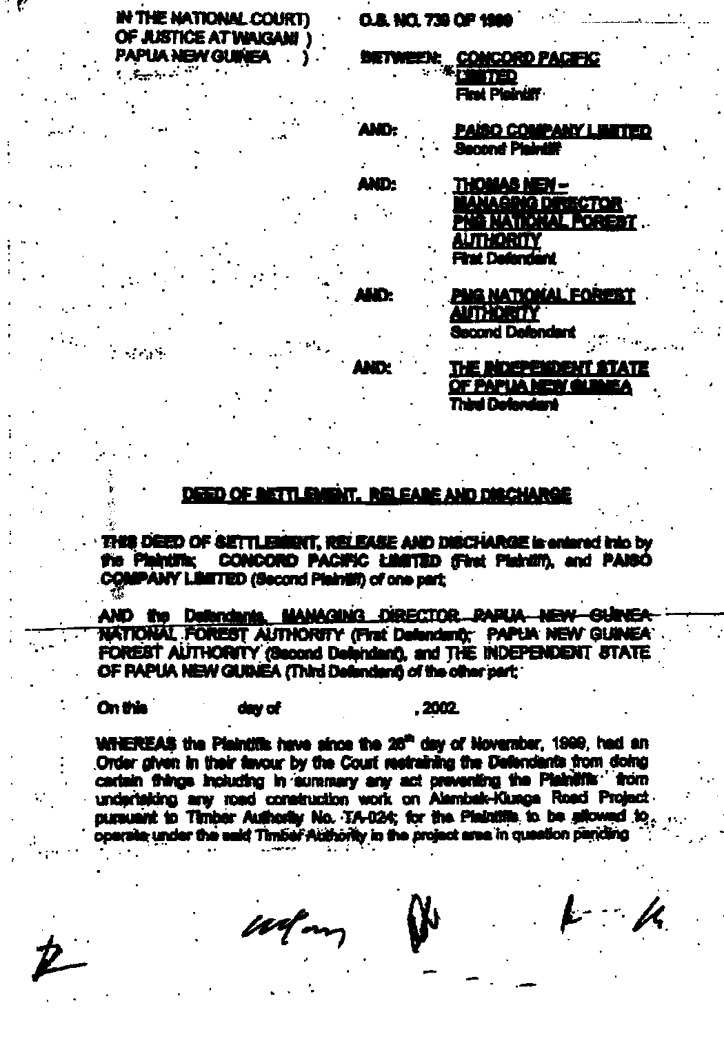 The Deed of Settlement is also in defiance of the findings of the 2001 Australian funded Independent Forest Review. That Review recommended that ‘Court action should be taken forthwith’ against the unlawfully logging operation and that any application to extend the logging project ‘should be soundly rejected’.