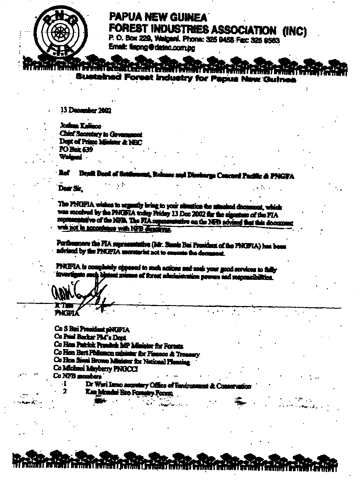 Valentine Kambori, Secretary for Planning, signed the legal document endorsing the illegal Kiunga Aiambak project in his new position as Chair of the National Forest Board. But, according to the Forest Industries Association, the document was never seen or endorsed by the Board (see their letter below dated 13 December 2002, to the Chief Secretary).