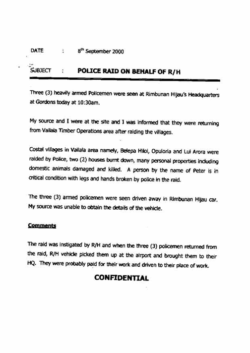 But, when you live in the remote and inaccessible forests of Gulf Province with no access to Government services or even basic communications systems it is pretty hard to make yourself heard. This is especially true when Rimbunan Hijau is able to fly in police mobile squads whenever anyone raises a voice in protest. This shown in an extract from the files of the National Intelligence Organization: