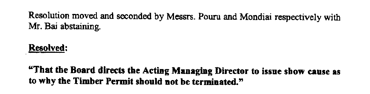 On hearing that the negotiations were totally stalled and that the logging company refused to lower its annual cut to the level necessary to make the project sustainable and ensure compliance with the Forestry Act, the Board resolved that Rimbunan Hijau should be issued with a ‘Notice to Show Cause’ why its logging operation should not be closed.