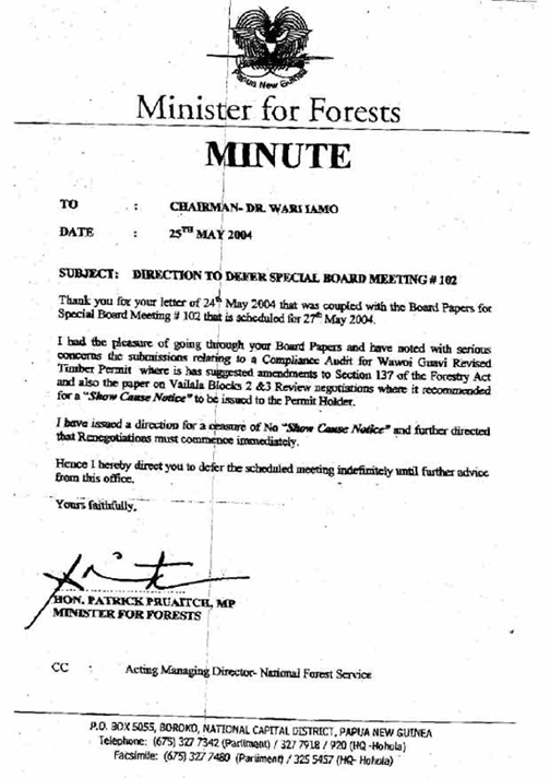 Masalai has obtained amazing new evidence showing how in 2004, Forest Minister Patrick Pruaitch brazenly broke the law to protect an RH logging operation from official scrutiny.